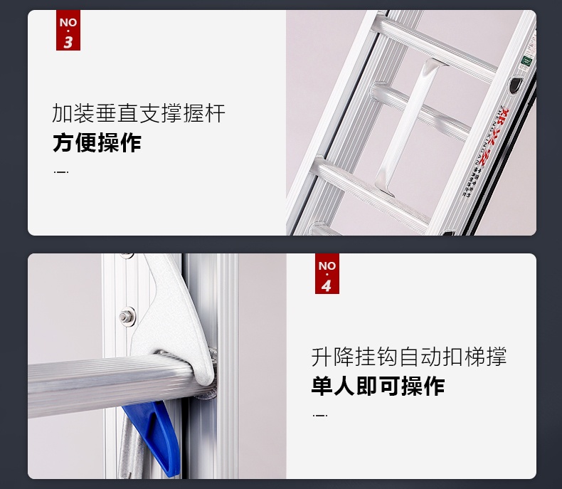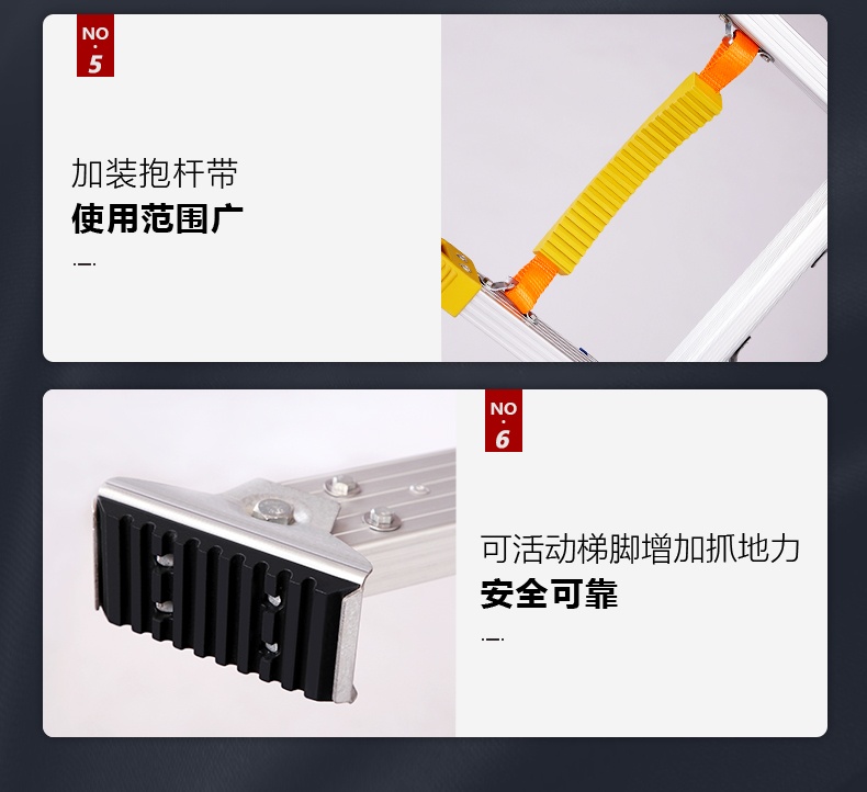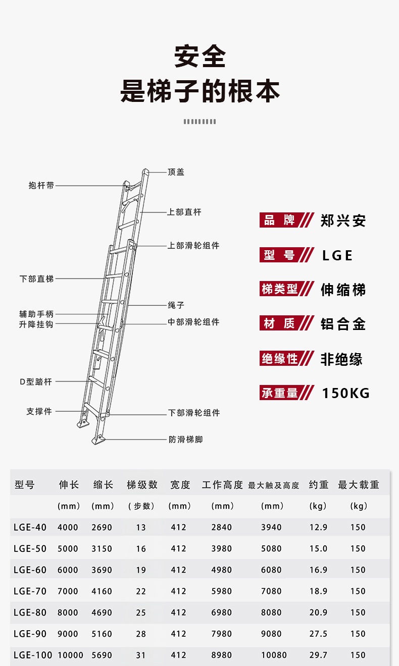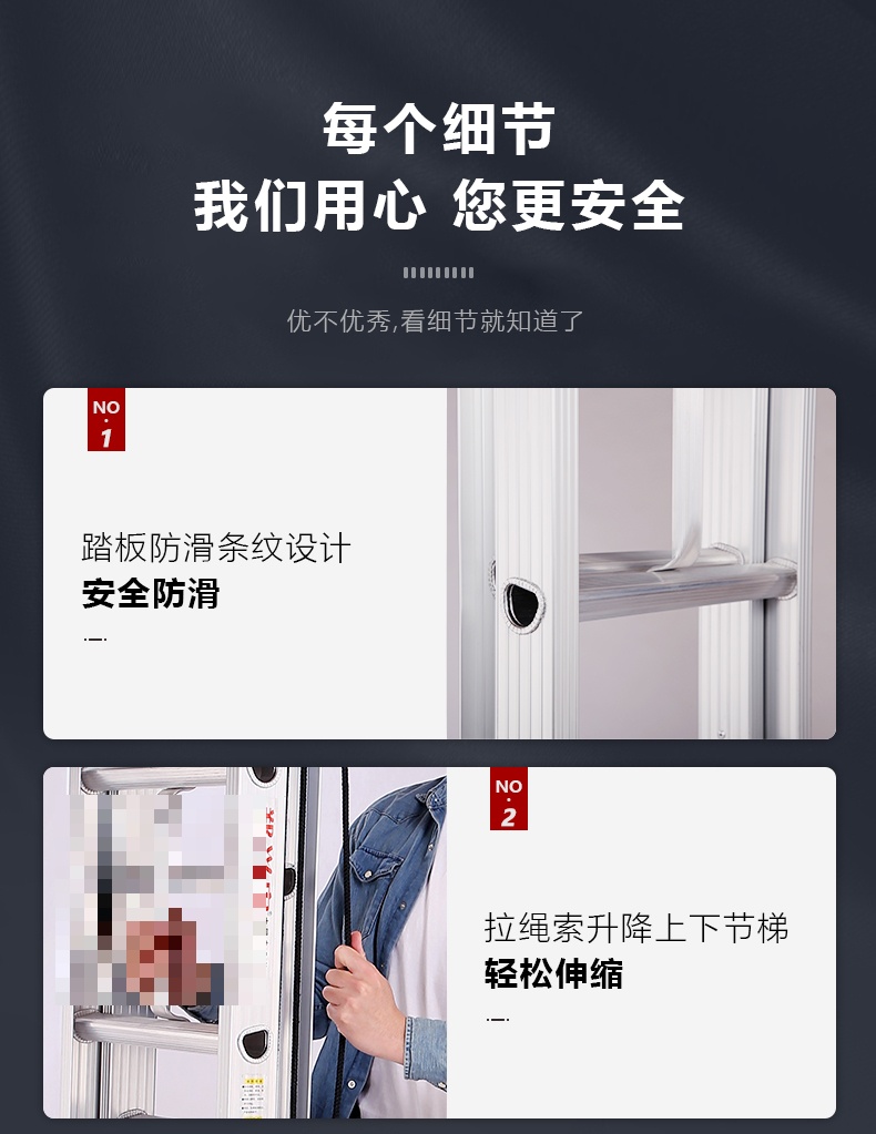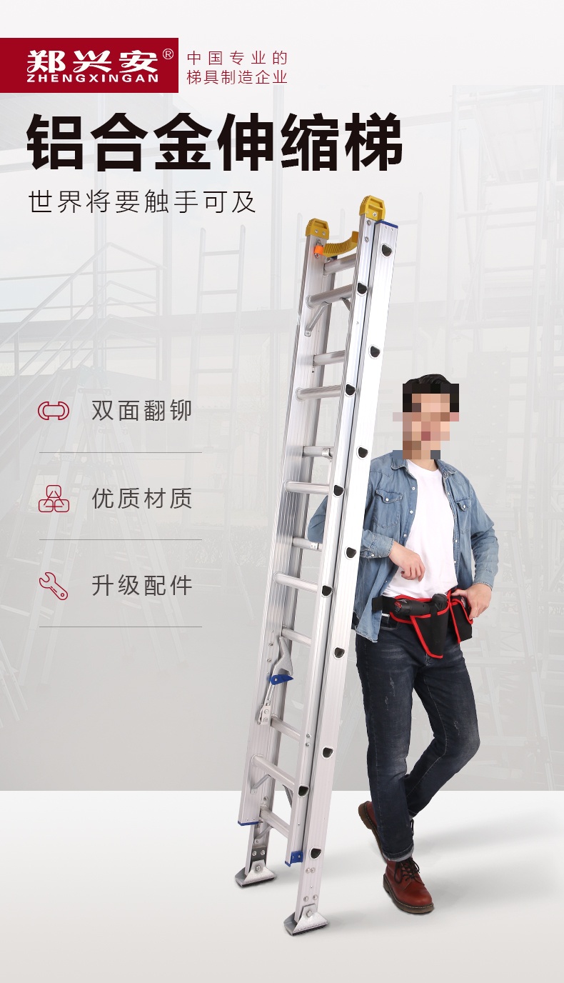 采用上下两节伸缩设计,借助升降挂钩、滑轮及拉绳实现梯体升降自如,操作便捷,收缩后长度仅2690mm,便于收纳与携带
