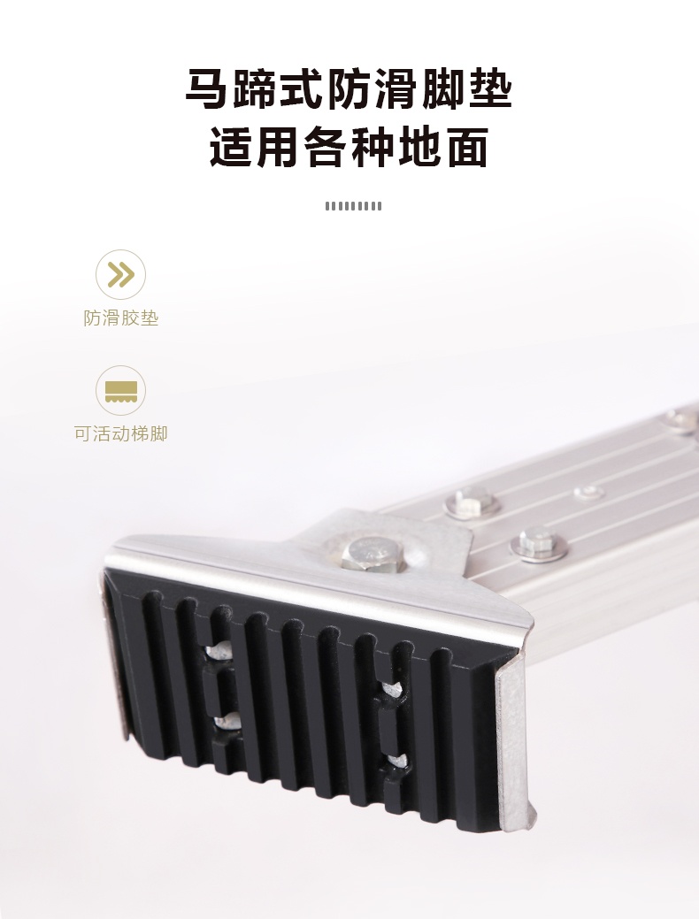 梯脚配备马蹄式防滑脚垫,适配多种地面类型,提升使用时的抓地力