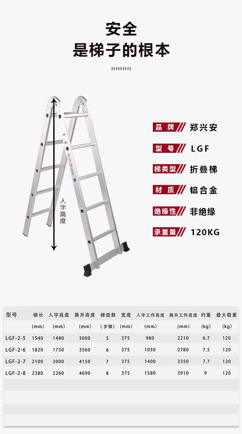 郑兴安 LGF-2-5 铝合金两关节折叠梯具有以下特点: