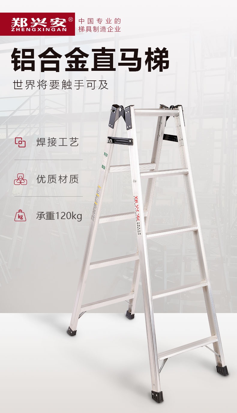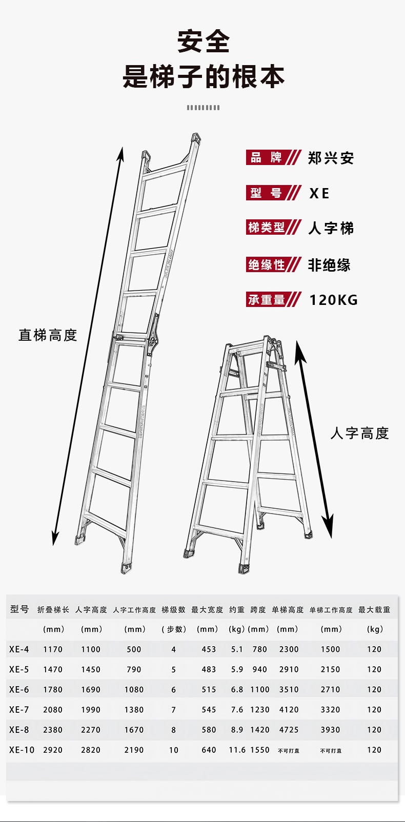 郑兴安 XE-7 铝合金直马梯 收缩梯长2080mm 人字高度1990mm 人字工作高度1380mm 梯级数7步 最大宽度545mm 自重约7.6kg 跨度1230mm 单梯高度4120mm 单梯工作高度3320mm 厚度160mm