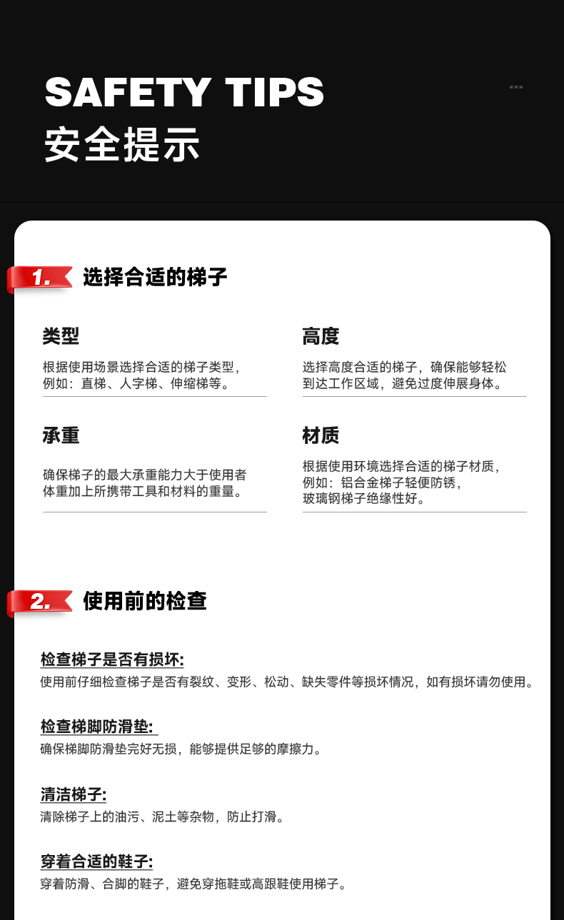 使用前需检查梯子各部件是否完好,连接处是否松动,确保结构稳固