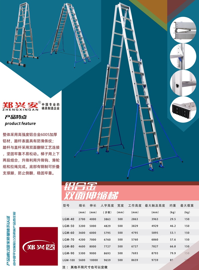 郑兴安 LGM-70 铝合金双面伸缩梯采用高强度铝合金6005加厚铝材,确保了梯子的坚固耐用和轻便性。