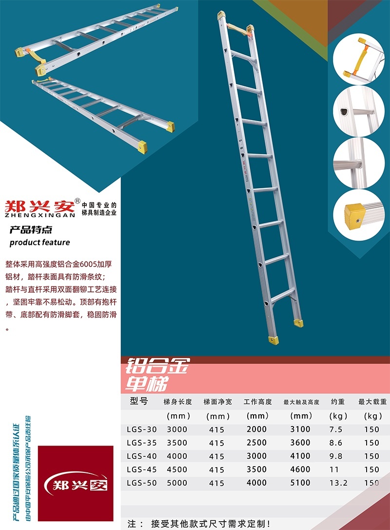 郑兴安 LGS-45 铝合金单梯采用高强度铝合金6005加厚铝材,确保了梯子的坚固耐用和轻便性。