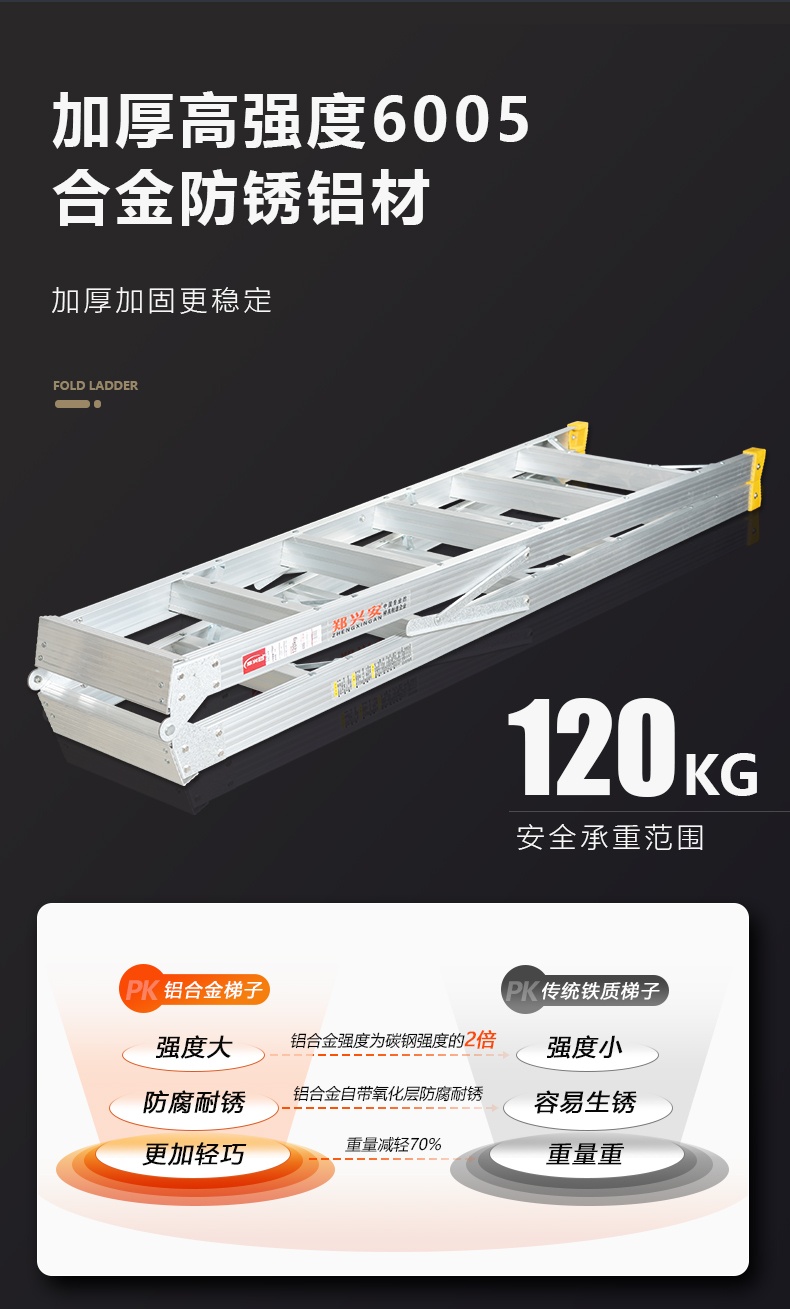 梯子的最大载重为120kg,切勿超载使用,以免发生意外。