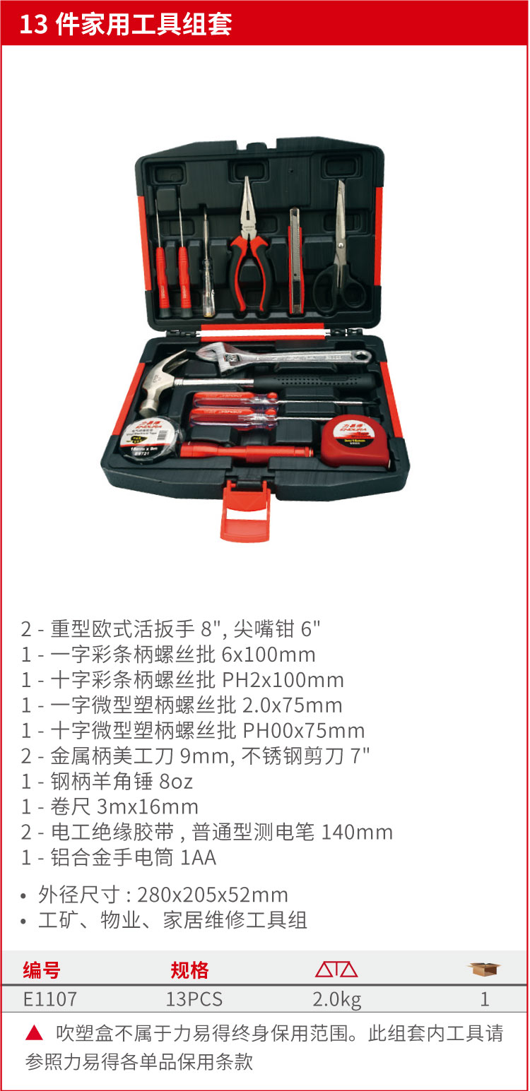 使用力易得 E1107 13件家用工具组套时,请注意以下事项: