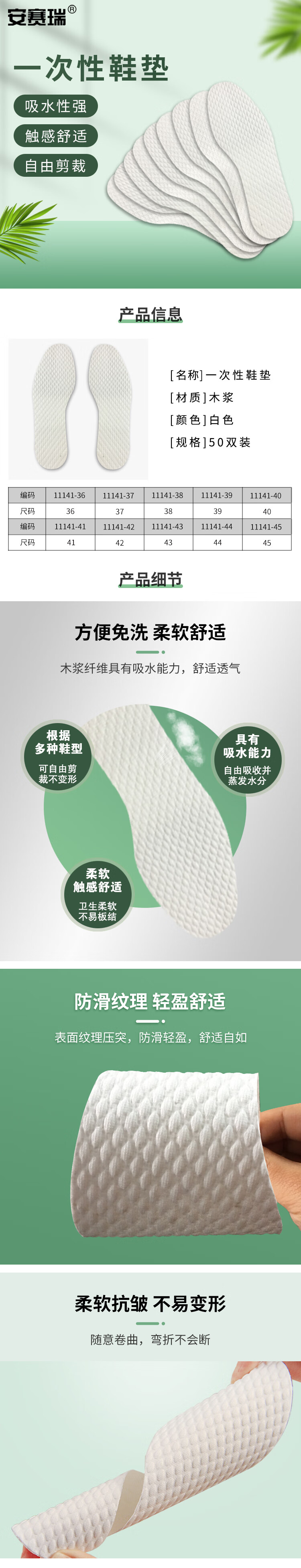 安赛瑞 一次性鞋垫 抛弃型透气加厚木浆男女卫生脚垫 36码 50双装 11141-36