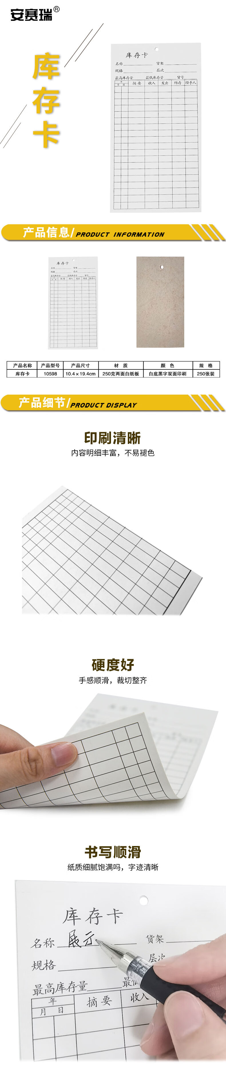 安赛瑞 库存卡 库存物料卡片 仓库进销存卡纸 库存信息卡片 双面印刷 250张装 104×194mm 10598
