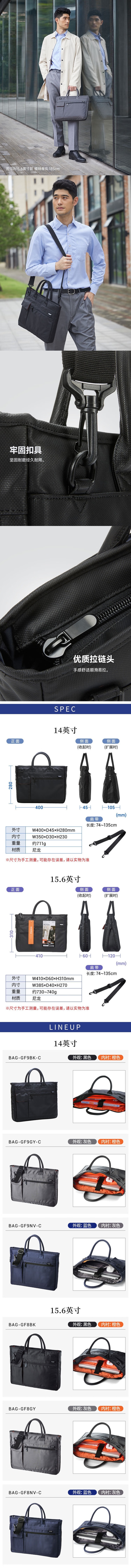 整体设计简约时尚,线条流畅,彰显干练商务风格,同时兼顾轻便性,整包重量约730~740g,携带无负担。