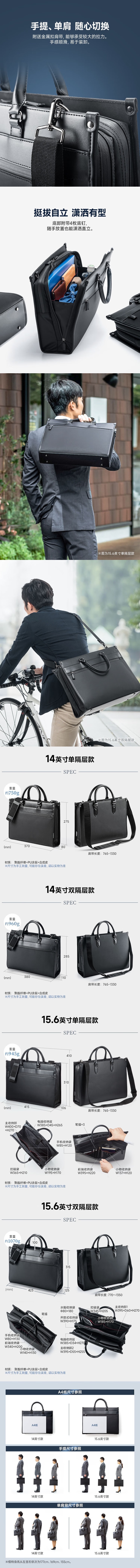 本款电脑包专为职场商务人士设计,适合日常通勤、商务会议、出差旅行等多种场合使用。无论是乘坐地铁公交、骑行上下班,还是在办公室内外移动办公,都能轻松应对。