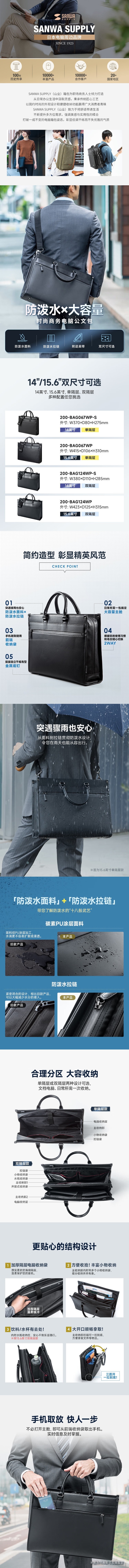 SANWA SUPPLY(山业)200-BAG067WP多功能商务电脑包采用聚酯纤维+PU涂层+合成皮材质,具备出色的防泼水性能,从面料到拉链均经过防水处理,有效防止雨水渗透,保障内部物品干燥安全。包体设计紧凑挺括,底部配备4枚金属底钉,可实现自立放置,提升使用便利性与外观质感。支持手提、单肩两种携带方式,附送可调节金属扣肩带,承重能力强且拆装便捷,满足不同场景需求。