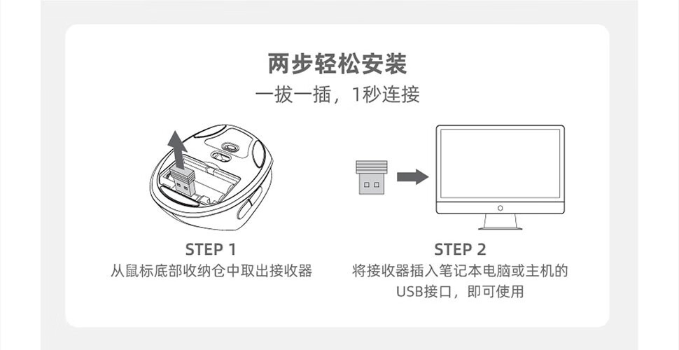 无线接收器收纳于鼠标底部,请注意妥善保管,防止丢失。若丢失,需更换同型号接收器才能恢复连接功能。