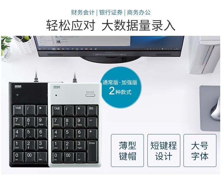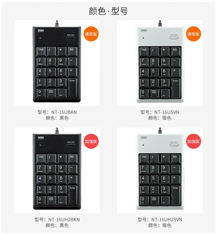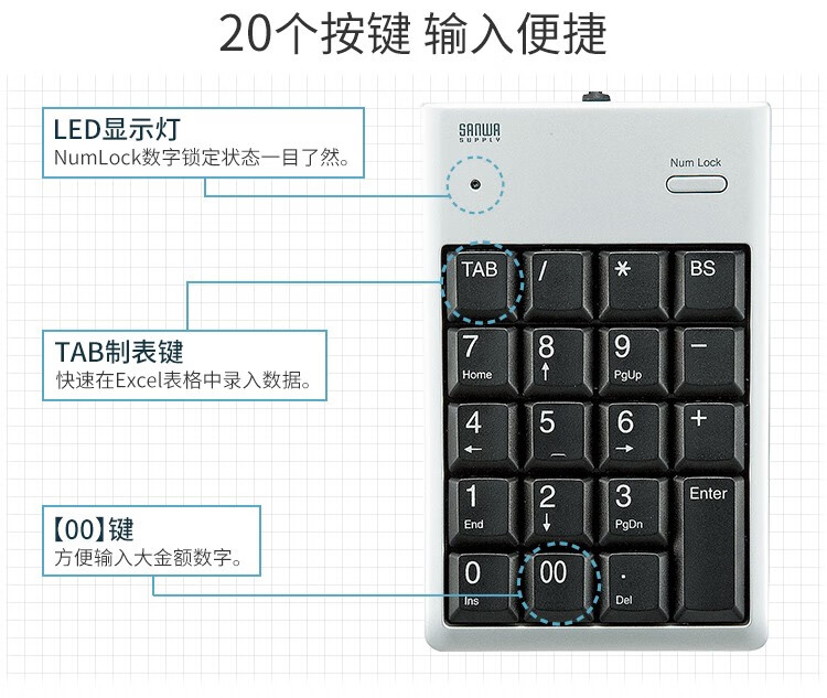 SANWA SUPPLY(山业)大尺寸USB数字键盘NT-16USVN专为高效率数据录入设计,具备20个按键布局,涵盖常用数字键、运算符号及功能键,支持快速准确输入。