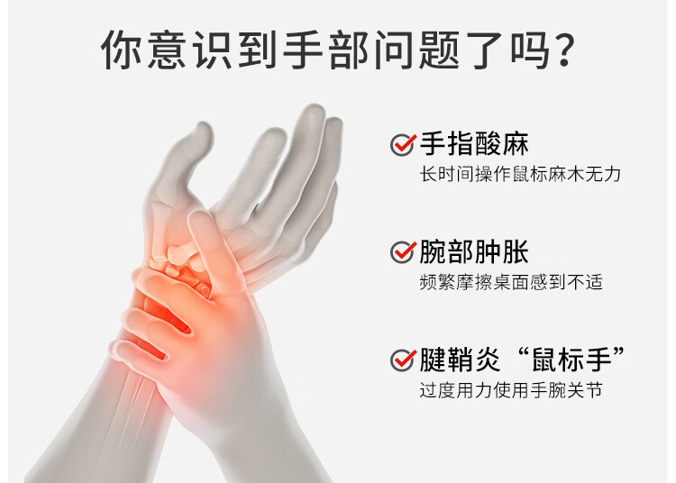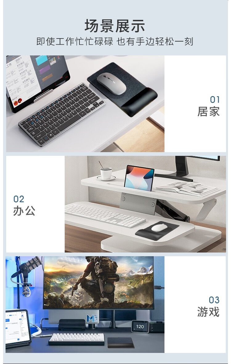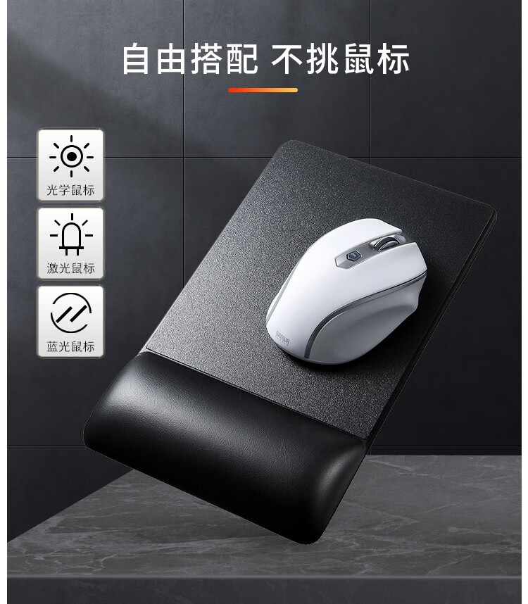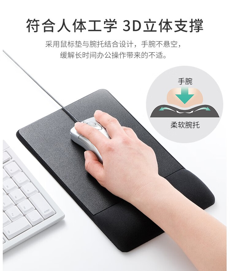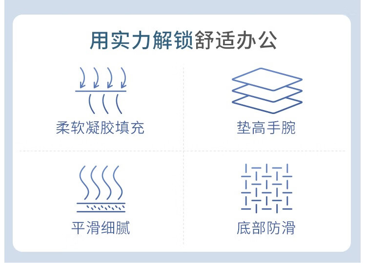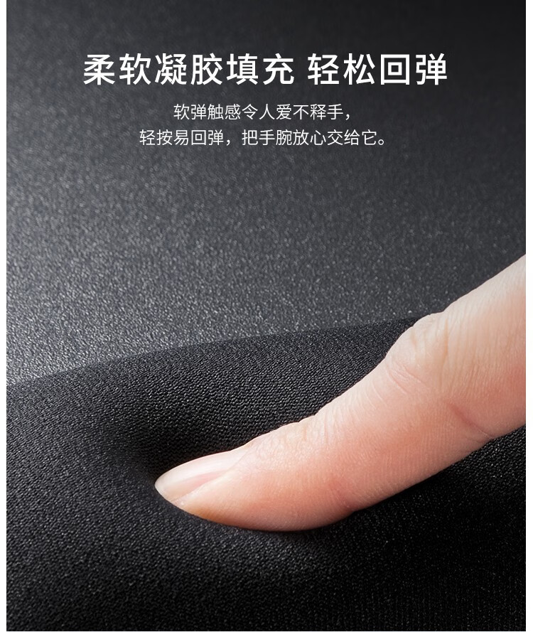 内置柔软凝胶填充腕托,提供高回弹支撑力,有效缓解手部疲劳,减轻腕部压力,预防腱鞘炎等‘鼠标手’症状。