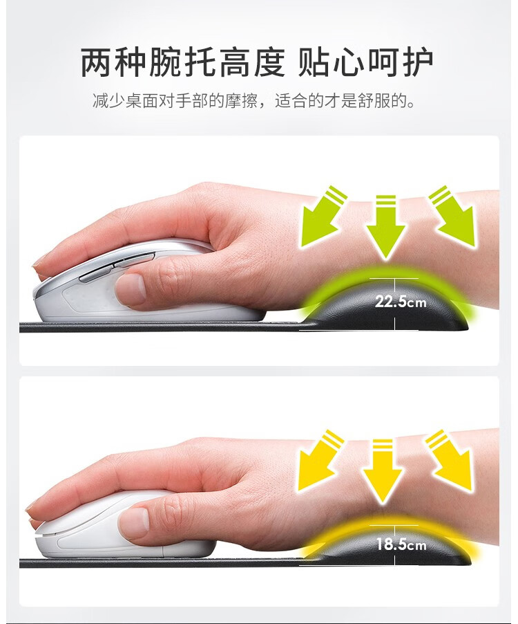 产品提供两种高度选择(22.5mm和18.5mm),满足不同用户的手腕弧度需求,符合人体工学3D立体支撑理念,使手腕自然放松,避免悬空不适。