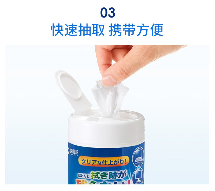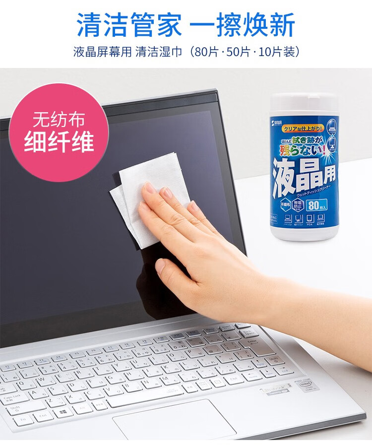 SANWA SUPPLY(山业)液晶屏幕清洁湿纸巾CD-WT4NS-C采用高品质无纺布材质,具备细纤维结构,触感顺滑柔软,清洁时手感舒适。