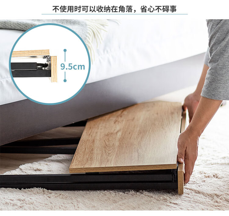 脚架底部配备高度调节器,可微调桌腿高度以适应不同地面平整度,确保桌面水平稳定。折叠后整体厚度仅9.5cm,可轻松收纳于床底、柜下或墙角等狭小空间,最大限度节省室内空间,特别适合小户型家庭、公寓或临时办公场景使用。