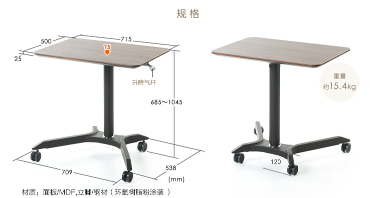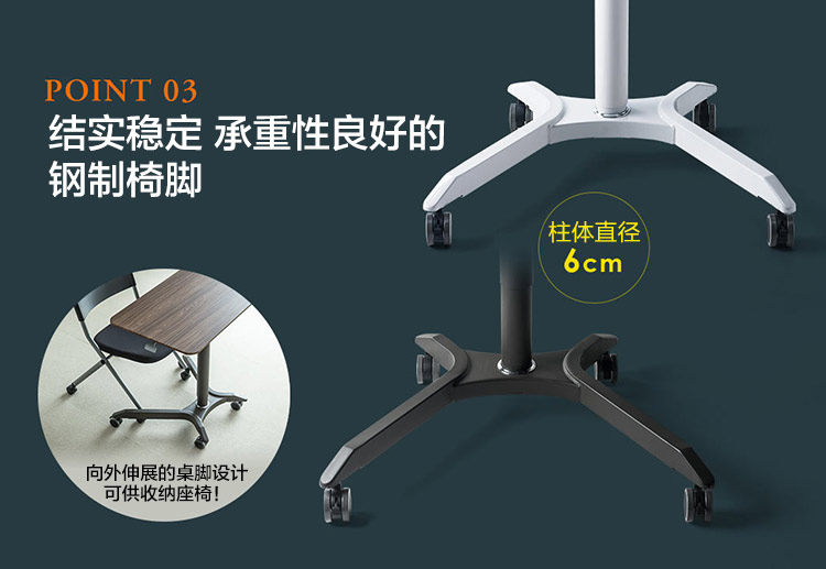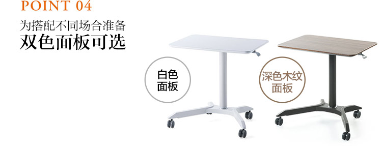 该产品配备钢制立柱和稳固的五爪底座,柱体直径达6cm,确保整体结构稳定且承重性能优异。桌面材质为MDF板,表面采用木质或白色面板两种选择,适应不同环境装饰风格,兼具美观与耐用性。底部装有带刹车装置的万向滚轮,方便移动的同时可随时锁定位置,保障使用安全。