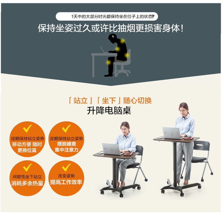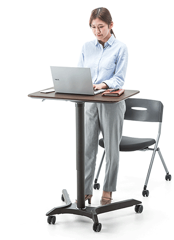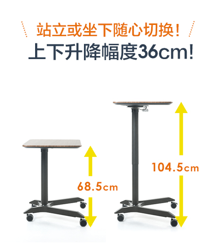 SANWA SUPPLY(山业)升降移动电脑桌100-ERD008M采用气杆式升降设计,高度调节范围为68.5cm至104.5cm,上下升降幅度达36cm,支持用户在站立与坐姿之间自由切换,有效缓解久坐带来的身体疲劳。桌面尺寸为71.5×50cm,提供充足的操作空间,可轻松容纳笔记本电脑、平板及办公文具,最大承重可达15kg,满足日常办公需求。