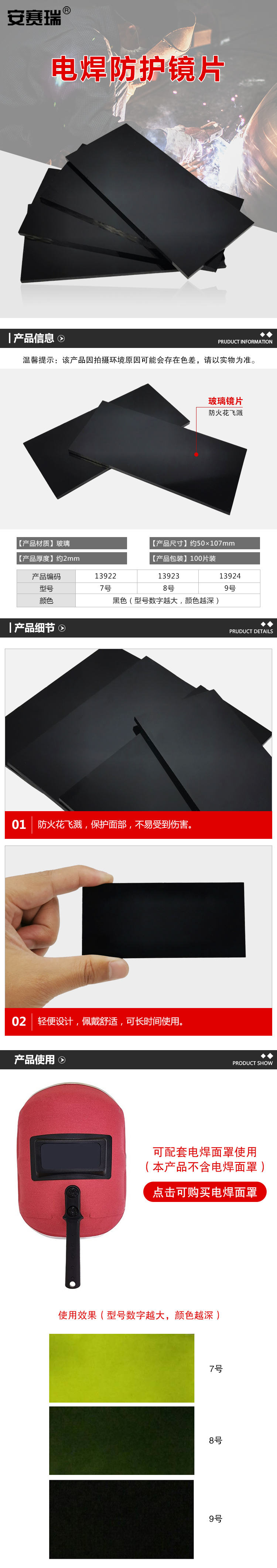 9号黑色镜片,型号数字越大颜色越深,能有效阻挡电焊强光