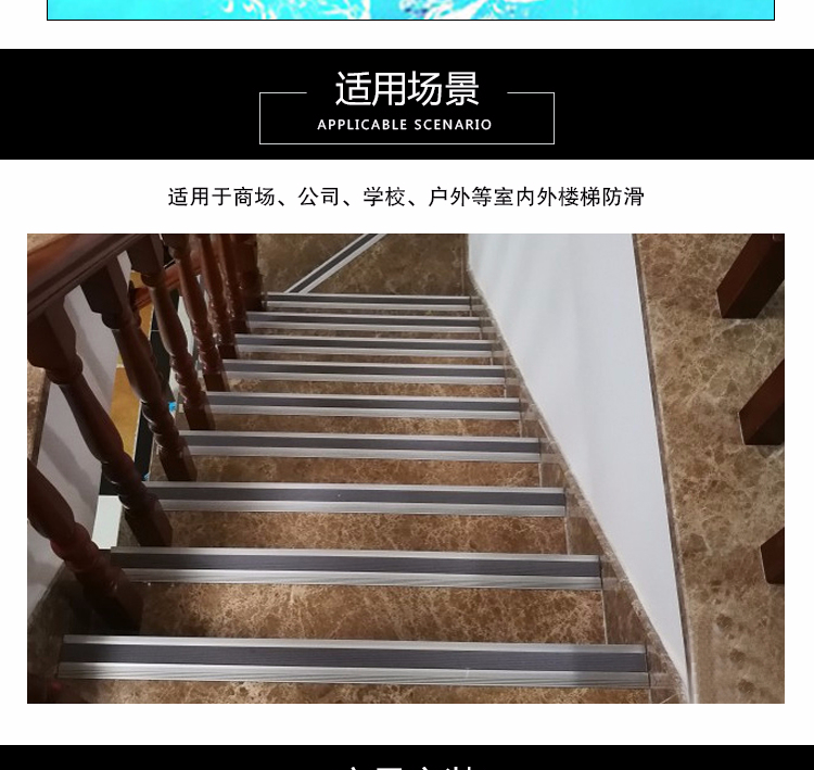 该防滑条广泛应用于商场、公司、学校、户外等室内外楼梯防滑处理。具体应用案例包括: