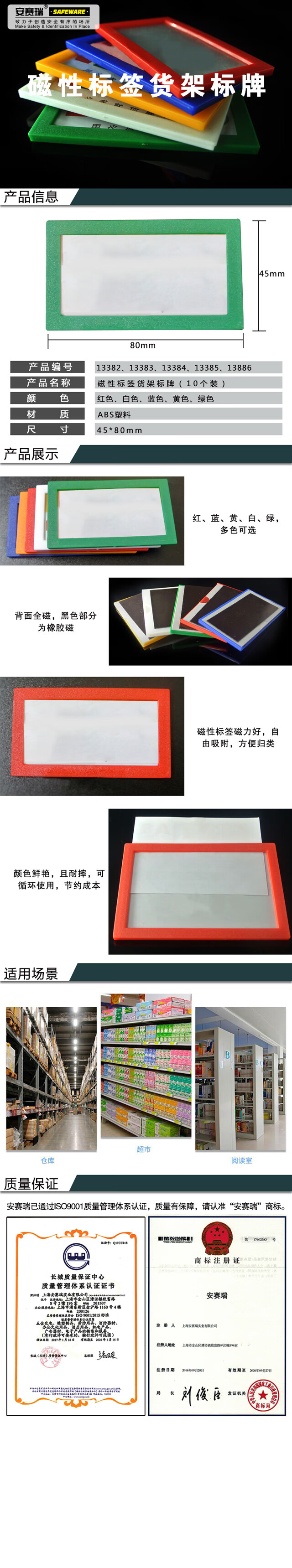安赛瑞13382货架物料信息磁性卡套采用ABS塑料材质,具有优异的耐用性和抗冲击性能,适合在工业仓储环境中长期使用。