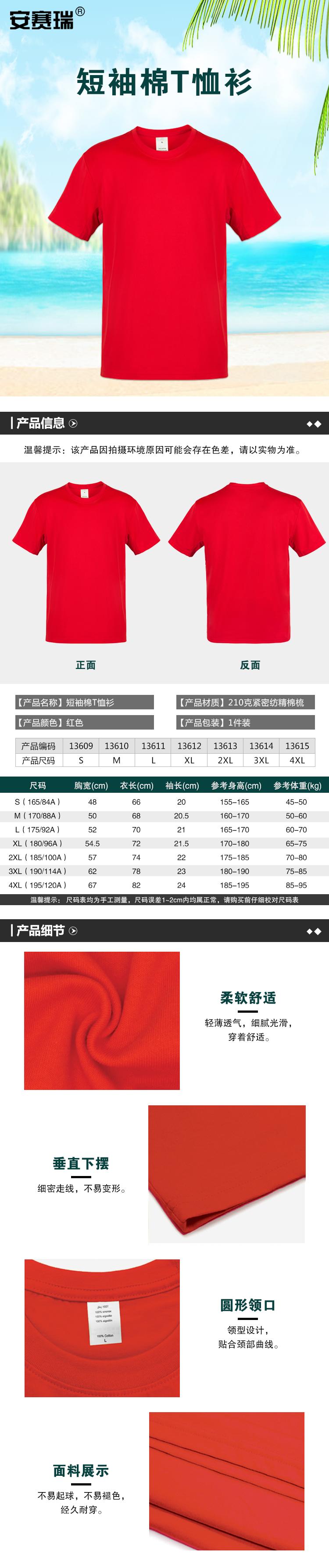 安赛瑞 短袖棉T恤衫 T恤工作服 文化衫短袖T恤衣服 聚会团队服广告衫 2XL码 红色 13613