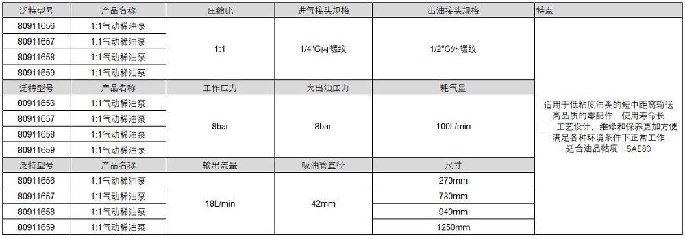 Forant(泛特) 80911659 1:1气动稀油泵具有以下特点:
