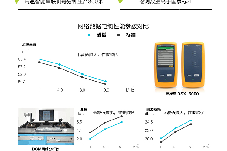7 高速智能串联机每分钟生产800米,检测数据高于标准,体现爱谱华顿的先进生产设备和严格质量控制。