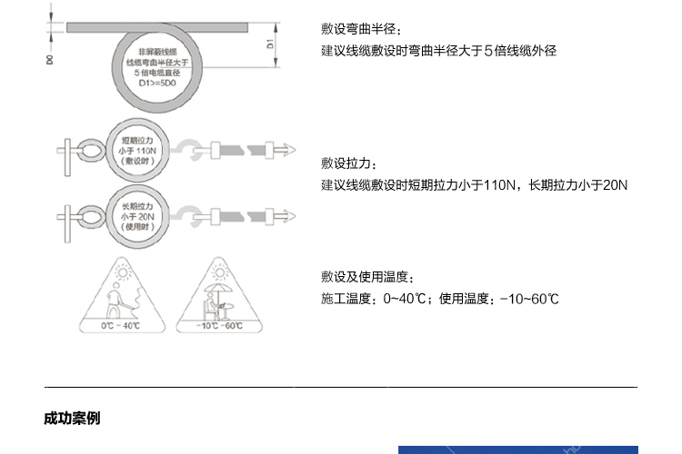 2 敷设拉力需控制在短期小于110N,长期小于20N,防止拉力过大引起电缆内部导体断裂或绝缘层损坏。