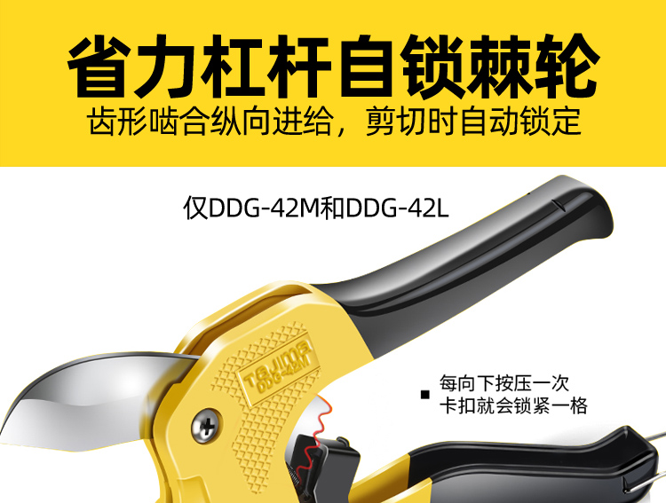 **省力杠杆自锁棘轮**:DDG-42M和DDG-42L型号配备省力杠杆自锁棘轮,每按压一次卡扣自动锁定一格,操作更加省力便捷。