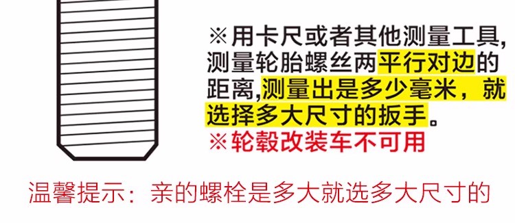 **轮毂改装车不可用**:特别注意,该扳手不适用于轮毂改装车辆,以免发生意外。