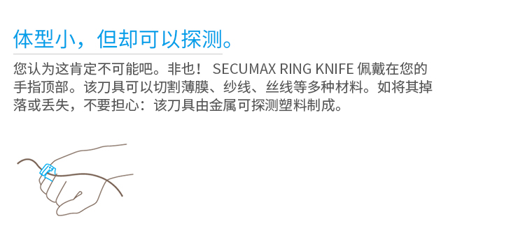 刀头设计为方形切口,切割深度达5.6mm,适用于薄膜、纱线、丝线、胶带、数层金属薄片等多种材料的精细切割。其人体工学设计贴合手指轮廓,适合食指至无名指佩戴,左右手皆可使用,操作灵活舒适。