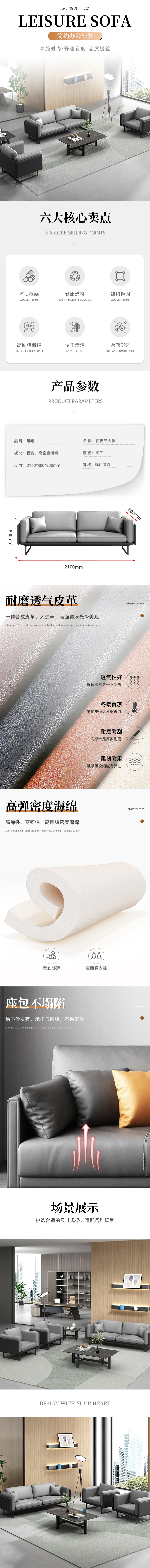此外,该沙发具备良好的清洁维护性能,表面污渍易擦拭,日常保养简便。内部填充物为高弹密度海绵,柔软舒适且支撑性强,久坐不累,满足商务与休闲双重需求。