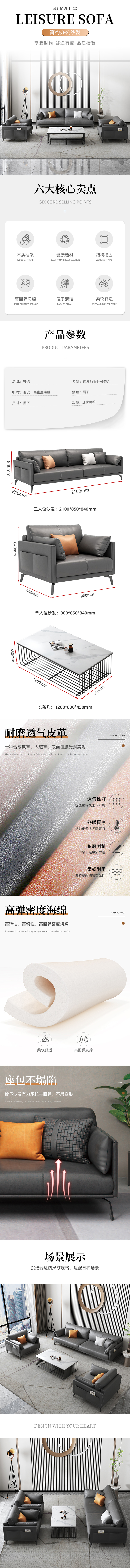 臻远ZYJJ-80184简约办公沙发洽谈接待沙发休闲沙发组合 西皮3+1+1+长茶几