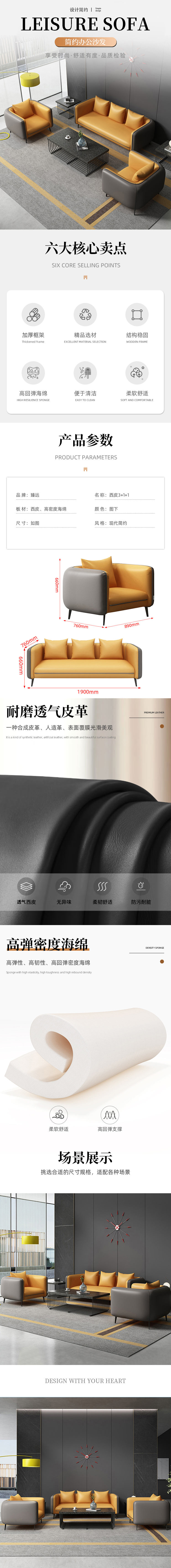 本款沙发专为办公环境设计,适用于企业前台接待区、会议室休息区、高管办公室、商务洽谈室等场所,也可用于酒店大堂、会所休闲区、高端咖啡厅或共享办公空间。其现代简约风格与高品质材质使其不仅具备实用性,更提升了空间的整体档次感。3+1+1组合形式灵活多变,可根据实际空间布局自由搭配,适应不同面积的室内环境。无论是用于客户接待、员工休息还是小型会议交流,均能提供舒适的坐感体验和专业的形象展示。同时,其耐磨损、易清洁的特性也特别适合人流较大的公共区域使用。