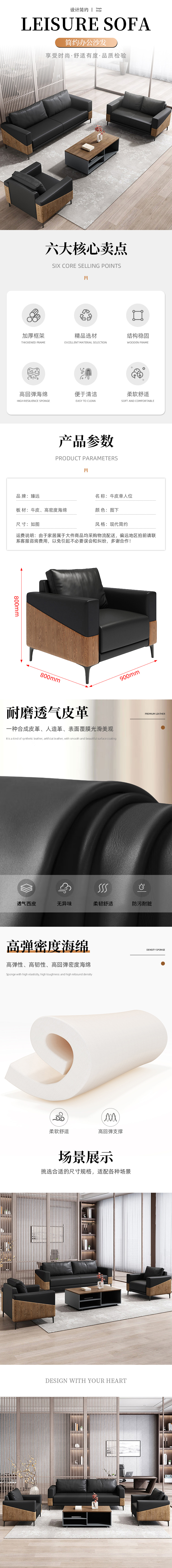 该沙发采用高品质牛皮材质,表面光滑细腻,具有良好的耐磨性和透气性,能够有效抵抗日常使用中的磨损和污渍,同时保持舒适的触感。内部填充高弹密度海绵,具备出色的回弹性能和承托力,长时间坐卧不易塌陷,提供柔软且支撑性强的坐感体验。框架结构采用加厚设计,结合实木与金属部件,确保整体稳固耐用,提升使用寿命。沙发造型简约现代,线条流畅,适合多种室内装修风格。尺寸为900mm×800mm×800mm(长×宽×高),属于单人位设计,空间占用合理,适用于小型办公区域或接待区。底部配备防滑脚垫,避免移动时刮伤地面。整款沙发注重细节处理,如缝线均匀、边角圆润,体现精致工艺水平。
