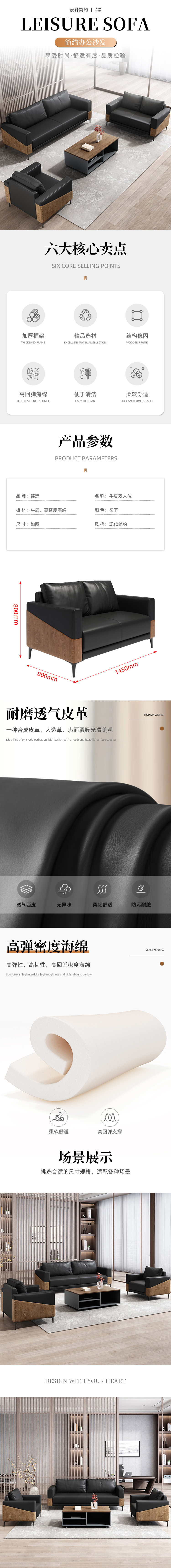 该款臻远ZYJJ-80226办公沙发采用高品质牛皮材质,表面光滑细腻,具有良好的耐磨性和透气性,触感柔软舒适,同时具备防污耐脏特性,易于日常清洁维护。沙发内部填充高弹密度海绵,具备高回弹性能和优异的支撑力,长时间坐卧不易塌陷,提供持久舒适的坐感体验。框架采用加厚实木结构,坚固耐用,有效提升整体承重能力与使用寿命。设计上融合现代简约风格,线条流畅,搭配原木色边框与黑色皮面,营造出稳重而不失时尚的视觉效果。沙发尺寸为1450×800×800mm,适合双人位使用,空间利用率高,适用于多种室内环境布局。此外,产品结构稳固,连接部位经过强化处理,确保长期使用的稳定性。