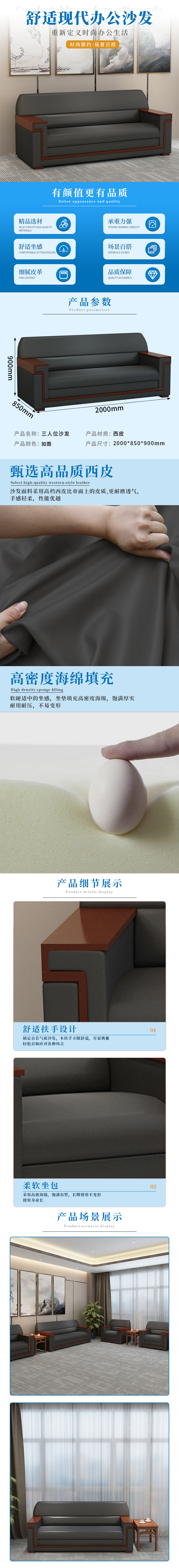 该款臻远ZYJJ-80242办公沙发采用高品质西皮面料,表面细腻光滑,具有良好的耐磨性和透气性,手感柔软舒适,优于普通人造皮革,能够有效抵抗日常使用中的磨损与划痕。坐垫填充高密度海绵,回弹性强,承重力高,长时间使用不易塌陷变形,提供稳定舒适的坐感体验。沙发框架选用优质实木结构,坚固耐用,确保整体稳定性与长久使用寿命。扶手设计符合人体工学,宽大厚实,方便放置手臂或物品,提升使用便利性。整款沙发为三人位直线型设计,尺寸为2000×850×900mm,适合多种办公空间布局,兼具现代简约风格与商务大气感。配套茶几组合可满足会议接待、会客交流等需求,提升整体空间协调性与实用性。