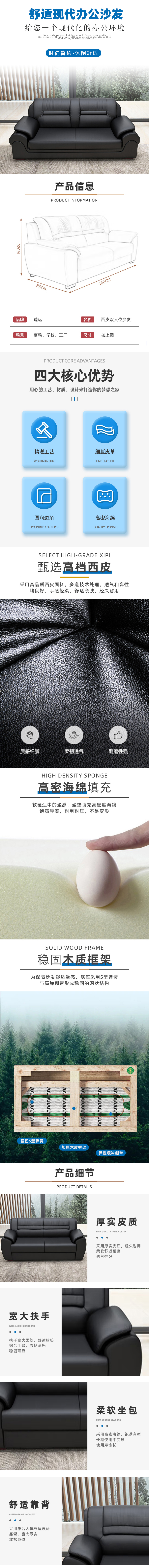 该款臻远ZYJJ-80245办公沙发采用高品质西皮(人造皮革)面料,表面细腻光滑,触感柔软舒适,具备良好的透气性和耐磨性,适合长时间使用。沙发内部填充高密度海绵,坐感适中,回弹性强,不易塌陷变形,确保长期使用的舒适度与耐用性。框架采用实木结构,搭配5型弹簧与高弹绷带形成稳固的网状支撑系统,有效提升整体承重能力和稳定性。沙发设计为双人位,尺寸为1680×860×920mm,符合人体工学原理,靠背弧度贴合脊椎曲线,提供良好支撑。扶手宽大厚实,便于放置手臂或小物件,兼具美观与实用性。整体造型现代简约,线条流畅,适用于多种商务环境,展现专业与稳重气质。