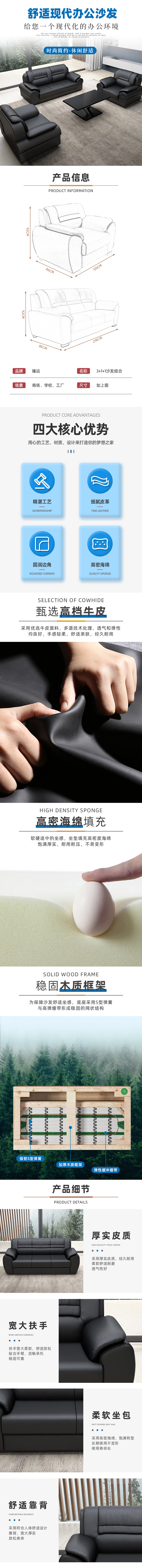 本款沙发专为商务办公环境设计,适用于企业接待区、会议室、高管办公室、学校行政接待室、工厂休息区等场所。其高端大气的外观和舒适的坐感,能够营造出专业、温馨的交流氛围。同时,也可用于酒店大堂、会所、展厅等需要展示形象的公共空间,兼顾实用性和美观性。3+1+1组合形式可灵活布置,适应不同空间尺寸,适合中大型办公区域或多功能厅使用。