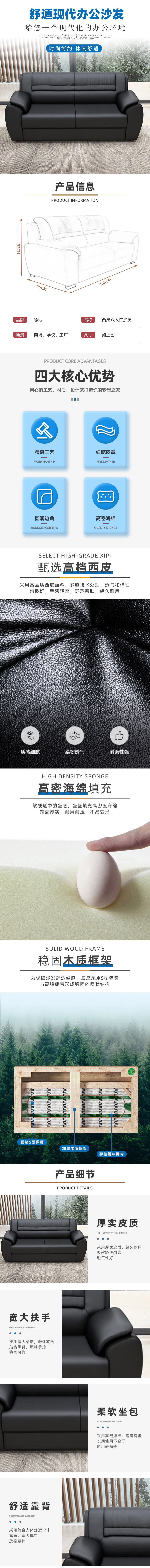 沙发设计为双人位直线型布局,尺寸为1680×860×940mm,适合中小型接待区或办公室休息区域。扶手宽大厚实,贴合手部曲线,提供良好支撑;靠背符合人体工学设计,放松脊椎,缓解疲劳。