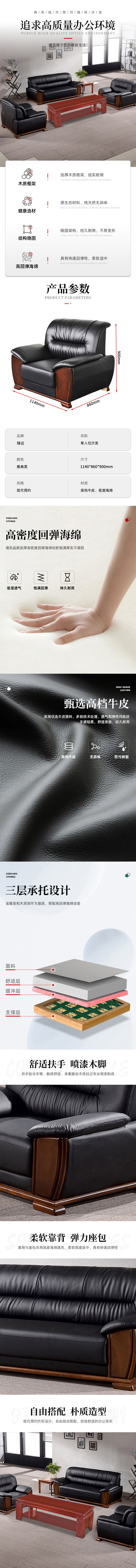 该款臻远ZYJJ-80280办公沙发采用高档牛皮材质,表面经过精细处理,具有良好的透气性与耐磨性,触感柔软细腻,长期使用不易开裂或变形,适合商务接待及日常办公环境。沙发框架采用实木结构,搭配稳固的金属连接件,确保整体承重能力强、结构稳定耐用。坐垫部分选用高密度回弹海绵,具备出色的回弹性与支撑力,长时间久坐也不会塌陷,有效缓解腰部压力。沙发内部采用三层承托设计,由上至下分别为面料层、舒适层、缓冲层和支撑层,实现多重减压效果,提升乘坐舒适度。扶手设计符合人体工学,贴合手掌曲线,提供良好的支撑体验;脚部采用喷漆木脚,美观大方且防滑耐磨。整款沙发为单人位设计,尺寸为1140×860×900mm,线条简洁流畅,现代简约风格,易于与多种办公家具搭配组合,适用于小型会议室、经理室或接待区等空间。此外,沙发支持自由组合拼接,可灵活搭配茶几及其他配套家具,打造统一协调的办公会客区域。