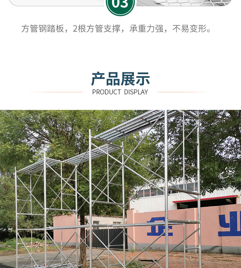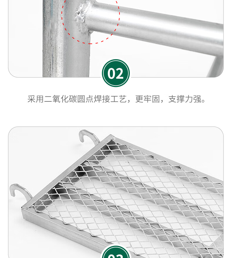 5 方管钢踏板设计,配备两根方管支撑,承重能力强,不易变形,有效保障作业人员的安全。