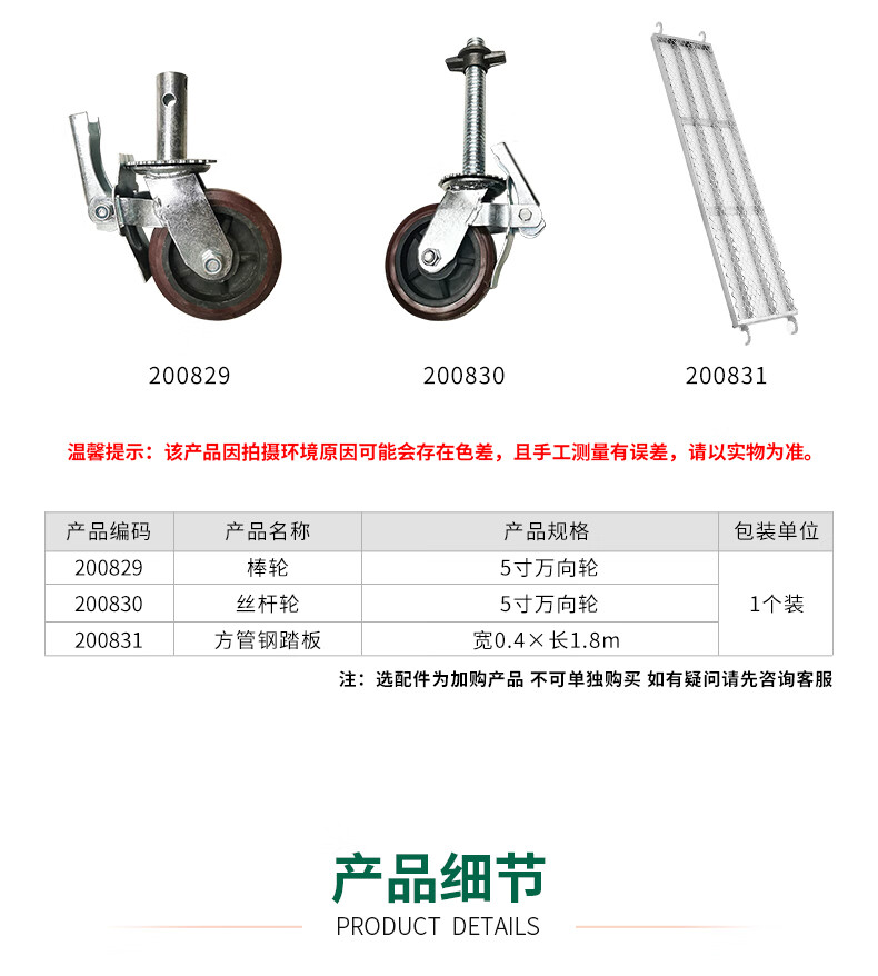 1 安装前请检查脚轮和脚手架各部件是否完好无损,确保所有连接件紧固。