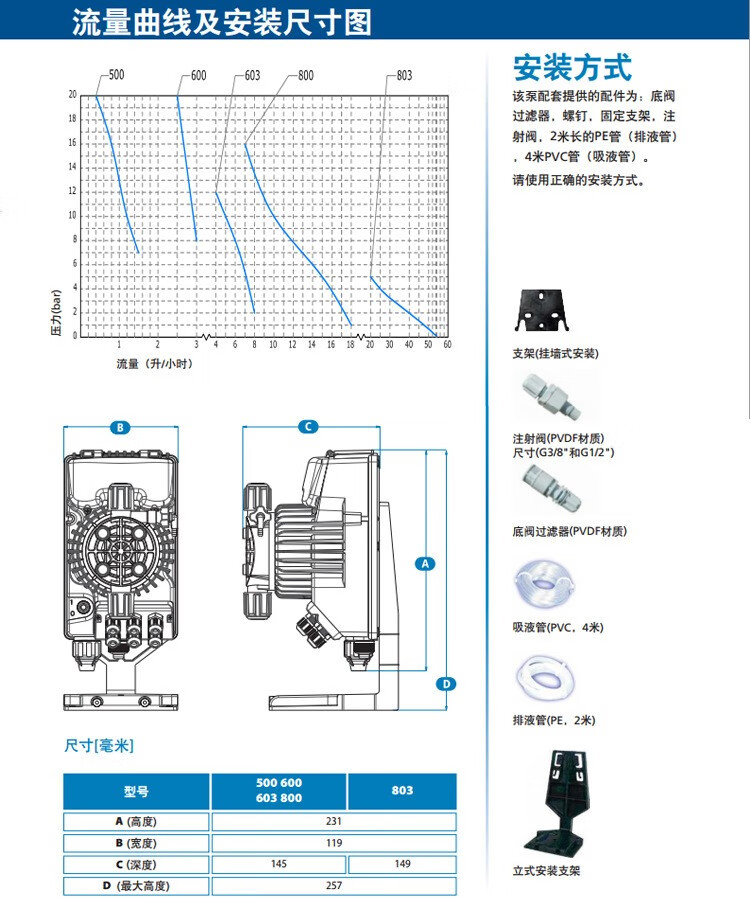 3 **性能参数**:最大压力可达10bar,最大流量为9升/小时,适合多种工业应用需求。