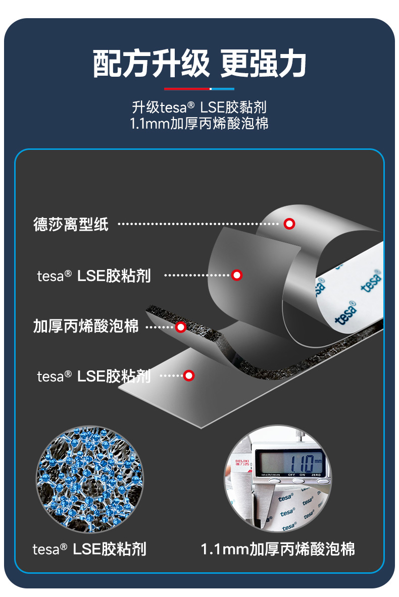 配方升级:1.1mm加厚丙烯酸泡棉,增强粘接强度,提升产品耐用性。