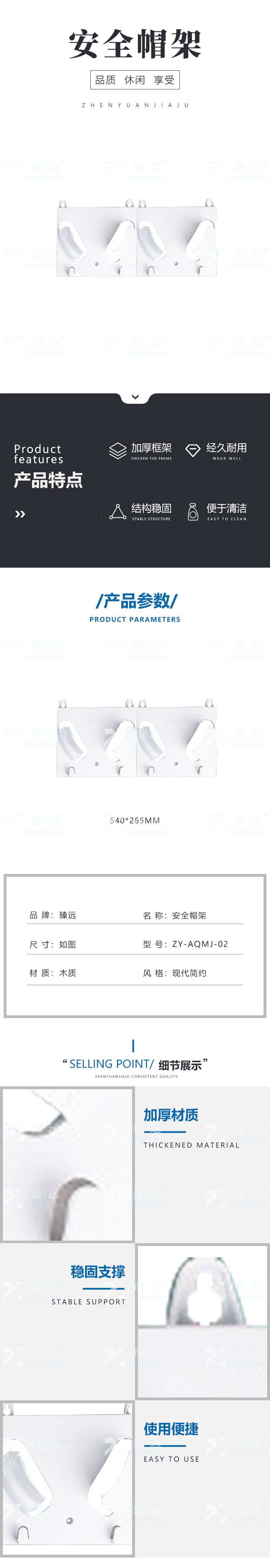 本款臻远ZY-AQMJ-02安全帽架采用加厚木质材质,结构坚固耐用,有效提升承重能力与使用寿命。整体设计为双位挂放结构,可同时存放两顶安全帽,节省空间且便于管理。产品尺寸为540*265mm,适合安装于车间、仓库、工地等工业场所的墙面,具备良好的稳定性与抗冲击性能。表面光滑平整,易于清洁维护,防止灰尘积聚,保持工作环境整洁。现代简约风格设计,兼顾实用性与美观性,适用于多种工业场景。挂架设有专用卡槽,能稳固支撑安全帽,避免滑落或变形,确保使用安全。