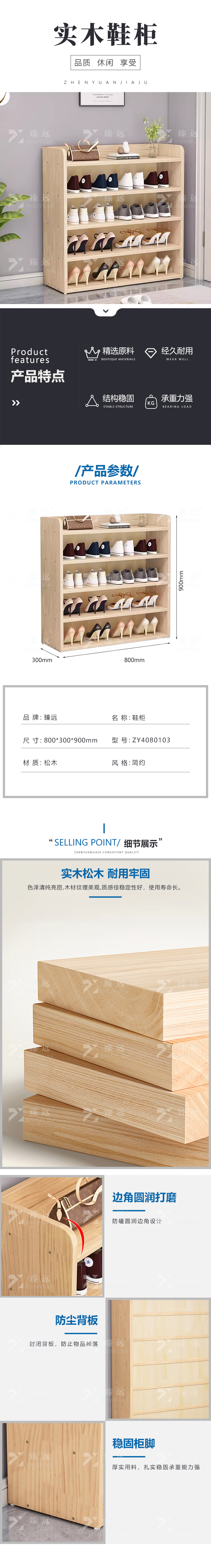 臻远 ZY4080103全实木鞋架多层置物架松木鞋柜 无漆