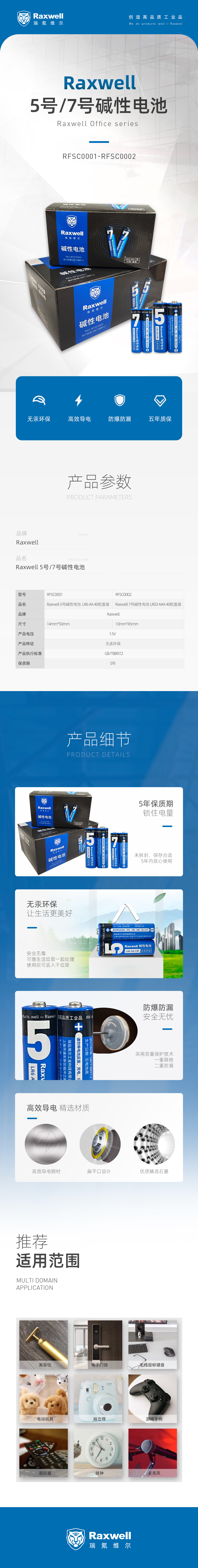 品牌可靠:Raxwell(瑞氪维尔)品牌,型号RFSC0001,属于Office系列柱形碱性电池