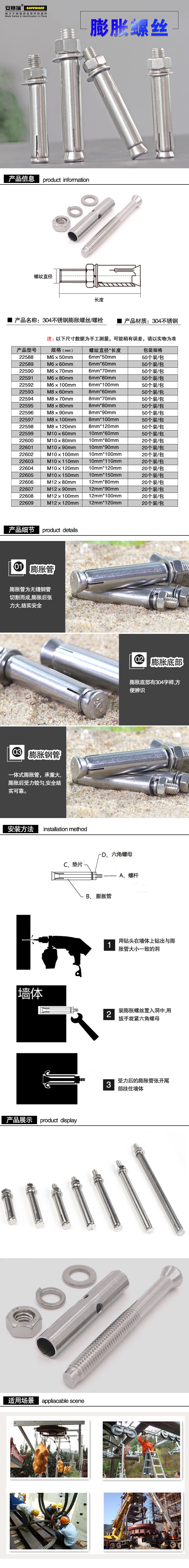 安赛瑞 304不锈钢膨胀螺丝螺栓 膨胀管 拉爆螺丝螺栓 M8×100mm 50个装 22597